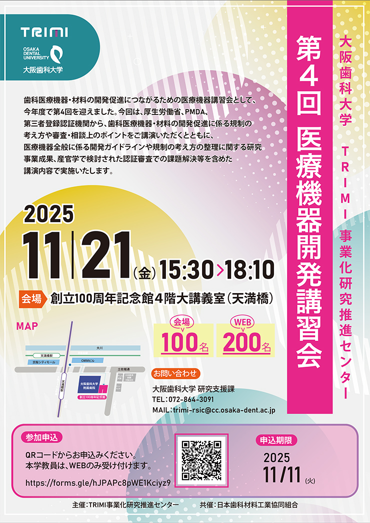 日 時 2025年11月21日(金)15:30~18:10 会 場 創立100周年記念館4階大講義室(天満橋)(京阪本線、地下鉄谷町線 天満橋駅 徒歩5分) 開催方式 会場及びWEB 定 員 会場100名WEB200名 参加申込 お申込みはこちら 本学教員は、WEBのみ受け付けます。 申込期限 2025年11月11日(火) 主 催 大阪歯科大学 TRIMI事業化研究推進センター 共 催 日本歯科材料工業協同組合 お問い合わせは下記へお願いします。 大阪歯科大学 研究支援課 TEL:072-864-3091 MAIL:trimi-rsic@cc.osaka-dent.ac.jp 日本歯科材料工業協同組合 TEL:03-3851-7217 MAIL:104seminar@jdma.jp