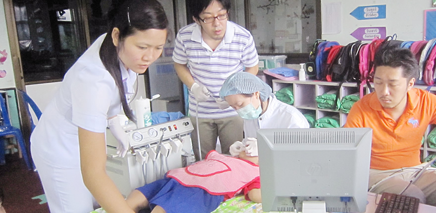 本講座の研究員は、国内外の機関に留学・研究経験を持ち、その研究活動としては、国内外の研究機関における基礎的な研究、そして、小学校、企業、保健所などのさまざまな現場に出向いて、お口の健康の現状についてフィールドワークを行うなど、研究となる対象が幅広いのが特徴です。それは、歯科医学にとどまらない多彩な領域との出会いを体験する機会ともなっているのです。