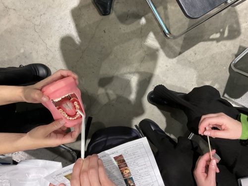 次に、口腔健康管理を「ケア技術」にとどめず、対象者を多面的に理解するためのアセスメント項目の一つとして位置づける重要性を確認。その上で、参加者とともに、歯周病や食物残滓のある顎模型を用いて、口腔アセスメントの基本的視点や観察項目について、演習を通してディスカッションしました。