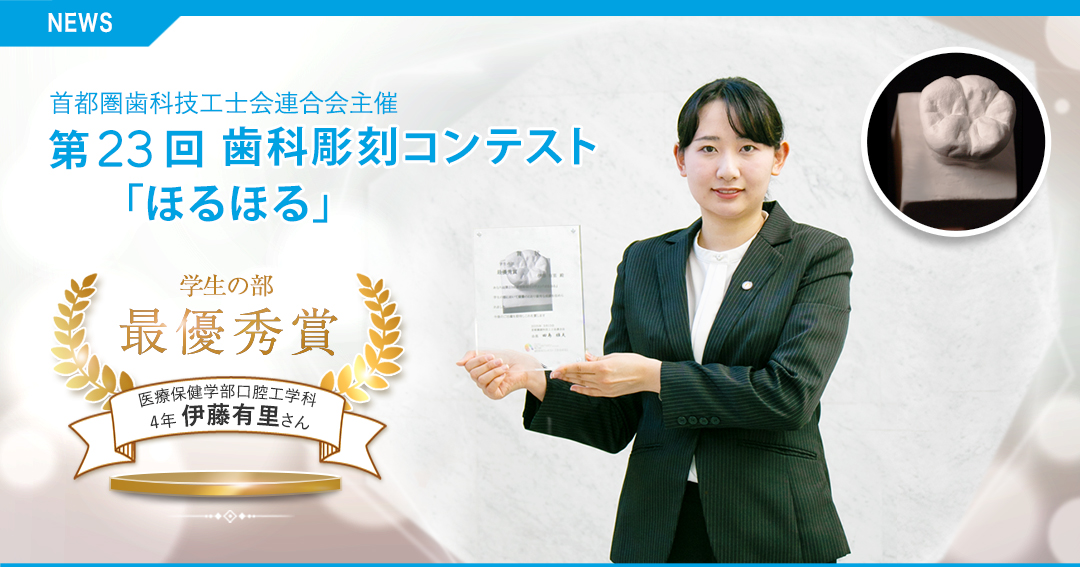 去る9月13日(土)、横浜市の鶴見大学で開催された第23回歯型彫刻コンテスト『ほるほる』(首都圏歯科技工士会連合会主催)において、本学医療保健学部口腔工学科4年の伊藤有里さんが、学生の部で最優秀賞を受賞しました。
