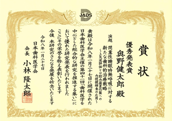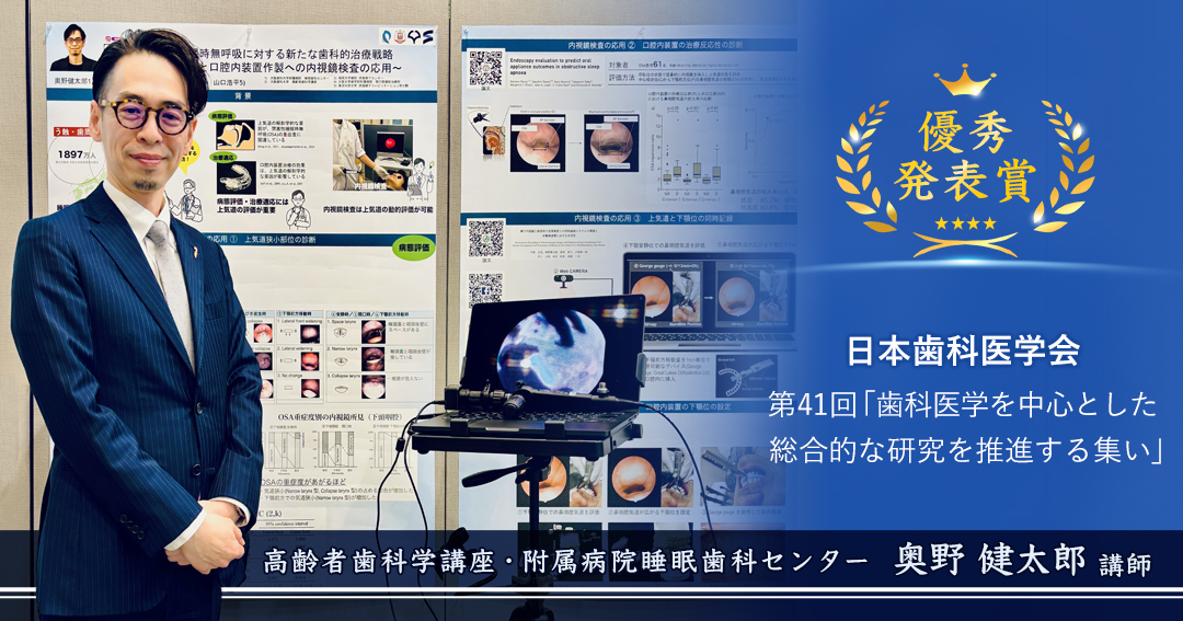 1月27日に東京都で開催された第41回「歯科医学を中心とした総合的な研究を推進する集い」(主催:日本歯科医学会)において、本学歯学部高齢者歯科学講座・附属病院睡眠歯科センターの奥野健太郎講師が優秀発表賞を受賞しました。