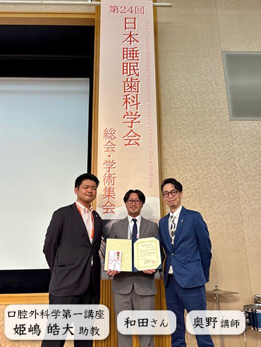 また、和田さんを指導した本学歯学部高齢者歯科学講座(附属病院睡眠歯科センター)の奥野健太郎講師は、「治療には必ず副作用(リスク)が伴い、その解明は臨床において極めて重要な意義を持ちます。副作用は発生頻度が低いため、多くの症例を扱う施設でなければ経験することが難しいのが現状です。本学附属病院の睡眠歯科センターは、日本における睡眠時無呼吸治療のハイボリュームセンターとして、トップレベルの実績を誇っています。大阪歯科大学だからこそ報告することができた本症例の経験が、学会優秀発表賞の受賞を通じて注目を集め、多くの歯科医師と共有されることで、結果的に睡眠時無呼吸症の患者さんにより適切な医療を届ける一助となることを期待しています」と話し、和田さんの報告が臨床現場にもたらす意義を強調しました。