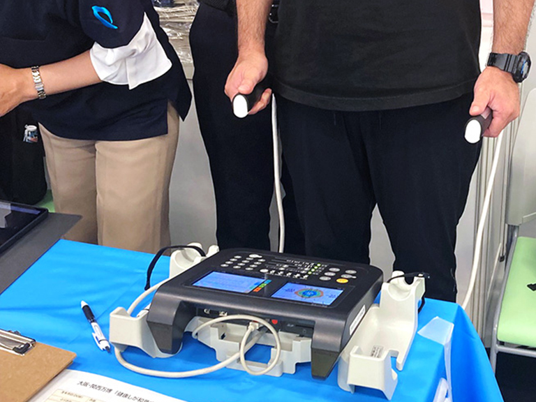 当日は、関西パビリオン多目的エリアにて来場者の体組成、自律神経、呼気圧、SpO2(酸素濃度)などを健康測定機器で計測し、健康状態を把握するサポートを行いました。
