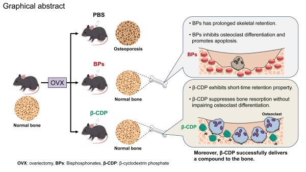 本研究で用いたのは、リン酸化β-シクロデキストリン(β-CDP)という化合物です。研究グループは、この物質が骨の主成分であるヒドロキシアパタイトに強く結合する性質を明らかにし、その性質を利用して薬剤を骨に集積させることに成功しました。さらにβ-CDP自体にも、破骨細胞の分化を妨げることなく、骨吸収活性のみを抑制する作用があることを見い出しました。